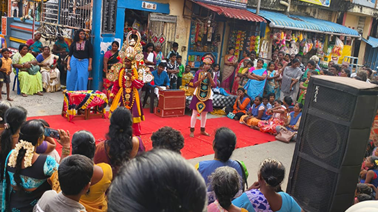 Lorry Lolakku was performed in open-air spaces at the heart of each village, catering to small audiences. The performances featured Kattaikkuttu songs with lyrics centered around COVID-19. The script ingeniously personified the Corona virus in a conversation with Yama Dharma Raja, the god of death and justice. Through this dialogue, Yama conveyed the message that while we will all eventually face death, the virus was accelerating our demise. Yama emphasised that by taking proper precautions, we could assist him in defeating the virus. The performance creatively incorporated a mask as a substitute for the traditional curtain, along with various humorous props. The comic routine of the 'kattiyakaaran' or jester effectively embodied the fears and concerns of the people, resonating well with the audience.